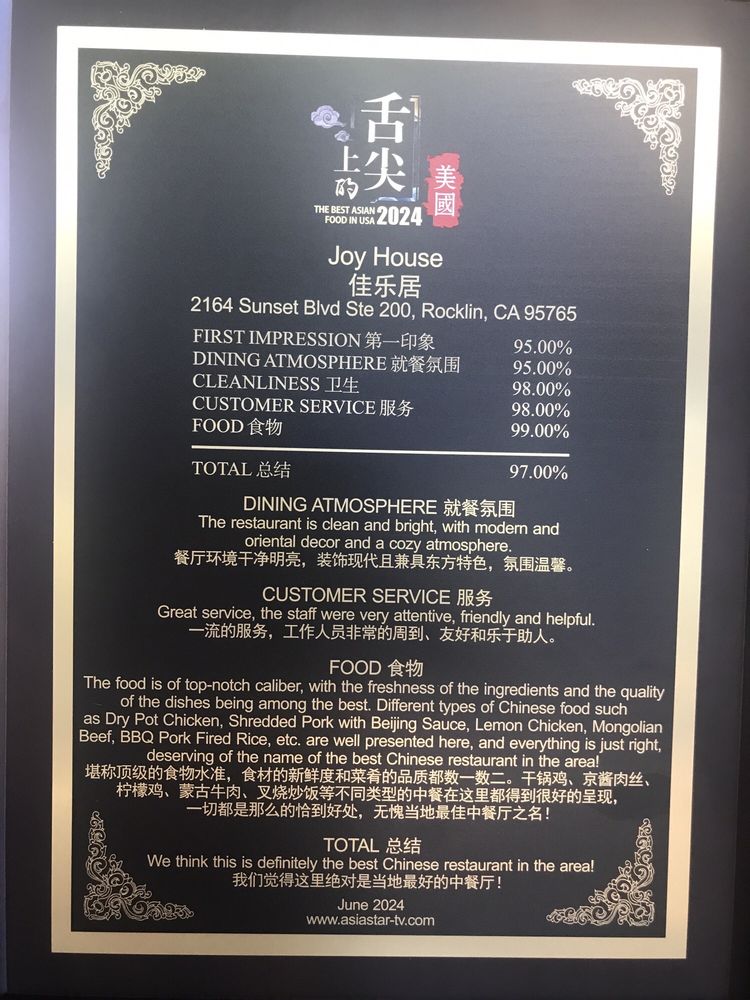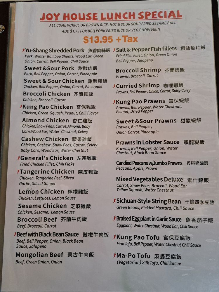 Introducing the menu at Joy House, a hidden gem in Rocklin, CA, offers a delightful array of authentic Chinese dishes. Customers rave about the flavorful options such as Cashew Chicken, Salt & Pepper Fish, Cumin Lamb, and Walnut Shrimp. The ambiance is spacious and welcoming, with attentive service and a diverse menu that includes sizzling rice soup, beef in hot chili sauce, and a variety of veggie dishes. A standout dish is the Tender Fish Filets in White Sauce, featuring unique ingredients like wood ear mushrooms. Joy House has been recognized as one of the Best Asian Food restaurants in the USA, and it lives up to its reputation with tasty, traditional Chinese cuisine. If you're a fan of Chinese food, Joy House is a must-visit for a memorable dining experience.